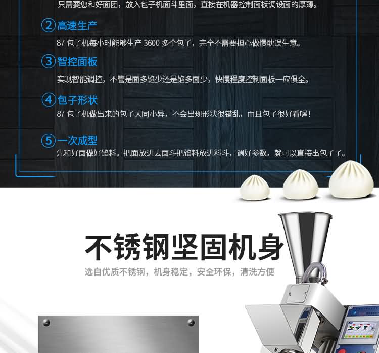 XZ-87型全自動包子機(jī)體積小重量輕,不銹鋼的外殼及食品接觸面,外觀精美,花紋更多,設(shè)計(jì)先進(jìn),生產(chǎn)性能穩(wěn)定精準(zhǔn),結(jié)構(gòu)簡單,操作方便??缮a(chǎn)各種肉包、肉菜包、菜包、小籠包、湯包、水晶包、圓饅頭、奶黃包、豆沙包、叉燒包、南瓜餅等幾十種包餡制品。