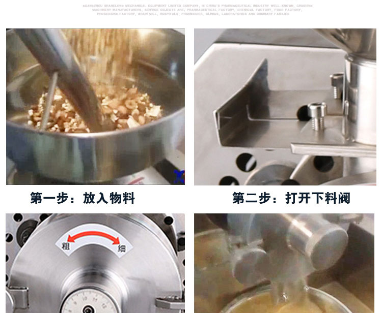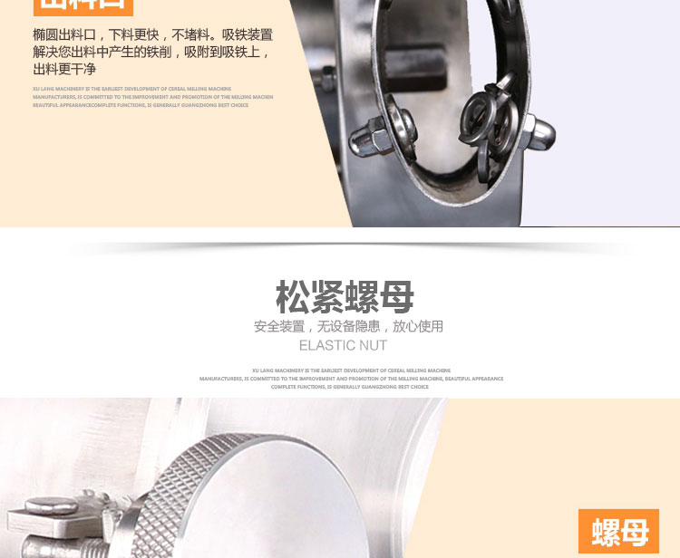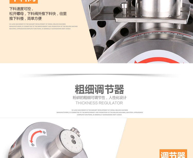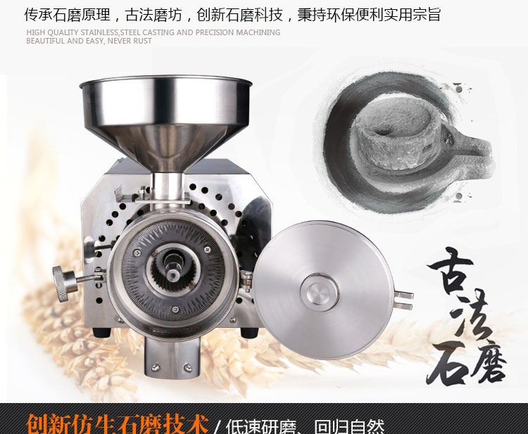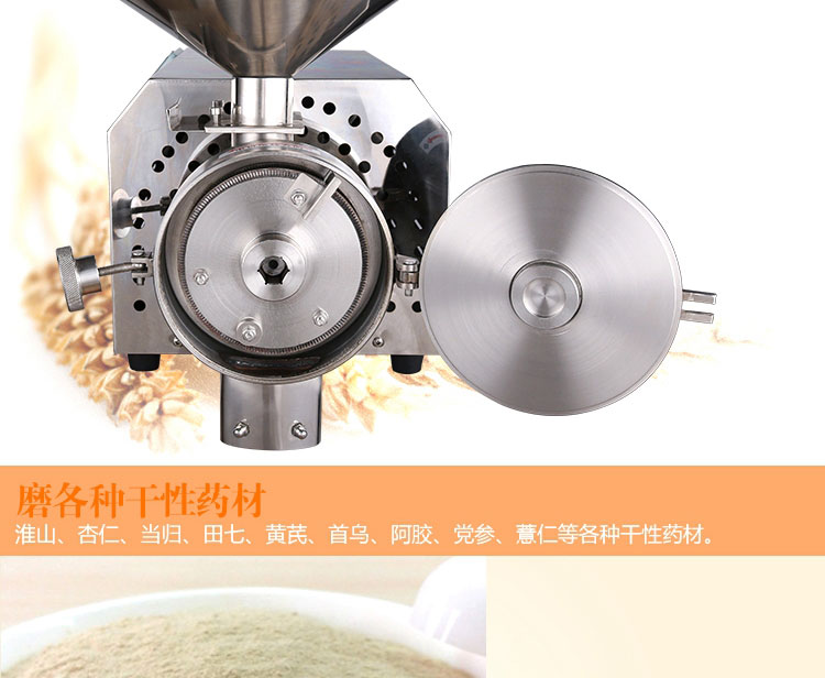 磨粉機的電機啟動運轉(zhuǎn)時,連接軸以及套在連接軸上的磨盤一起運轉(zhuǎn)。待磨物料從料斗進入磨粉套,磨盤的絞龍和磨粉套之間的相對運轉(zhuǎn),破碎力使物料絞碎成小塊顆粒,絞碎后的小顆粒在磨盤絞龍的螺旋運動下被帶進兩塊磨片中間,磨片齒紋的相對運轉(zhuǎn),使物料在短時間內(nèi)被粉碎成細小的粉狀顆粒,粉從磨片的齒溝流出,甩向四周,同時被裝在磨盤上的刮粉板帶下,從出粉口流出來。