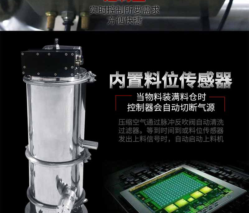 當(dāng)壓縮空氣供給真空發(fā)生器時(shí),真空發(fā)生器就產(chǎn)生負(fù)壓形成真空氣流,物料被吸入吸料咀,形成物氣流,經(jīng)過(guò)吸料管到達(dá)上料機(jī)的料倉(cāng)內(nèi)。過(guò)濾器把物料與空氣分離,當(dāng)物料裝滿料倉(cāng)時(shí),控制器會(huì)自動(dòng)切斷氣源,真空發(fā)生器停止工作,同時(shí)料倉(cāng)門(mén)自動(dòng)開(kāi)啟,物料落到設(shè)備的料斗中。與此同時(shí),壓縮空氣通過(guò)脈沖反吹閥自動(dòng)清洗過(guò)濾器。等到時(shí)間到或料位傳感器發(fā)出上料信號(hào)時(shí),自動(dòng)啟動(dòng)上料機(jī)。