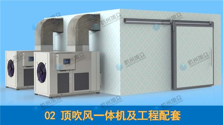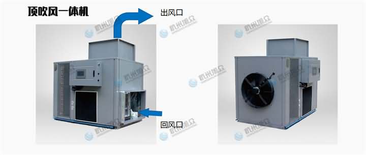 頂吹風一體與側(cè)吹一體原理是一樣的,只不過頂吹的回風口和出風口是通過風管連接到烘房,而且頂吹的出風口安裝有風機,其熱能不依賴風機墻來帶出熱能。