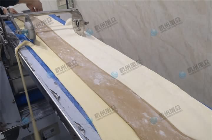 2、面團(tuán)再用壓面機(jī)壓成面皮后,按順序擺放好
