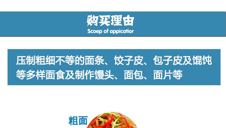 適用于賓館、面包店、糕點(diǎn)廠制作面包、西點(diǎn)、包子,可使反復(fù)壓制和面后的面團(tuán)、面筋,能得到增強(qiáng)。