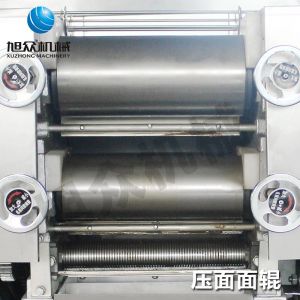 將攪拌好的面粉均勻的放進(jìn)去,面對輥將松散的面粉初壓成面皮,合皮部分有一對軋輥,它將兩層復(fù)合面皮合成一層,延軋部分由兩對軋輥組成,將面皮軋成所需的厚度,切條部分是將一定厚度的面皮切成所需寬度的面條,上門架部分把切斷后的面條自動(dòng)挑起。