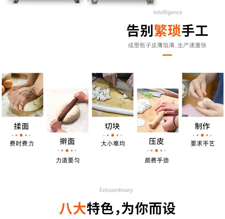 ◆ 各種制品大小、重量、皮餡比例隨意調(diào)整、定量精準(zhǔn),完善底薄漏餡、開裂等現(xiàn)象。