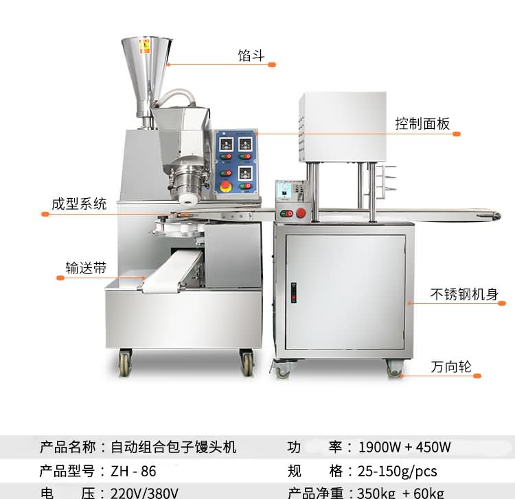 ZH-86型自動組合式包子饅頭機(jī)是一款產(chǎn)品性能穩(wěn)定、自動化程度高,功能多且產(chǎn)品多樣化的設(shè)備。采用高品質(zhì)微電腦變頻控制面板、電機(jī)電器,操作更方便、維護(hù)更簡單;不銹鋼制作、經(jīng)久耐用、美觀衛(wèi)生;可生產(chǎn)花包、光頭包、圓饅頭、南瓜餅、月餅、小籠包和各種肉餡、菜餡、純白糖餡、芝麻餡、豆腐餡等各種包餡食品。