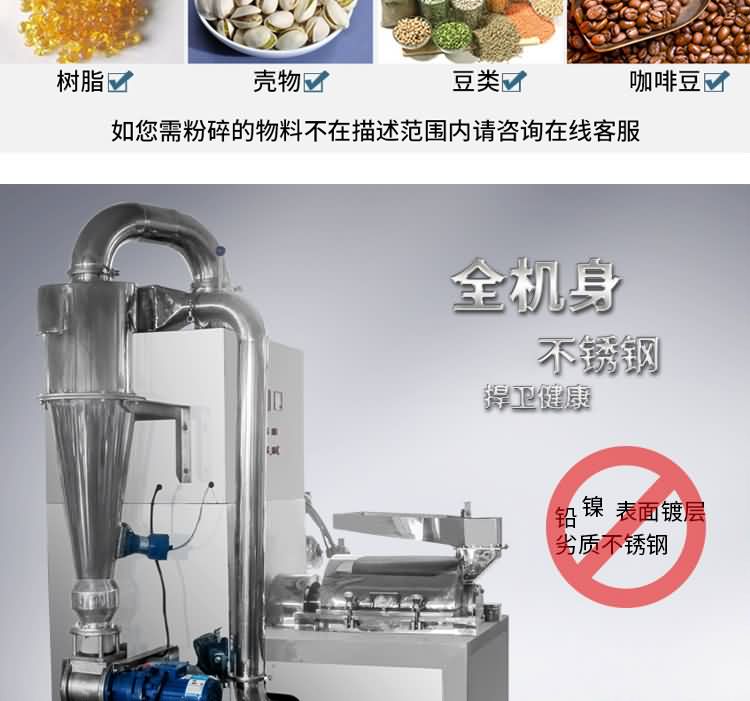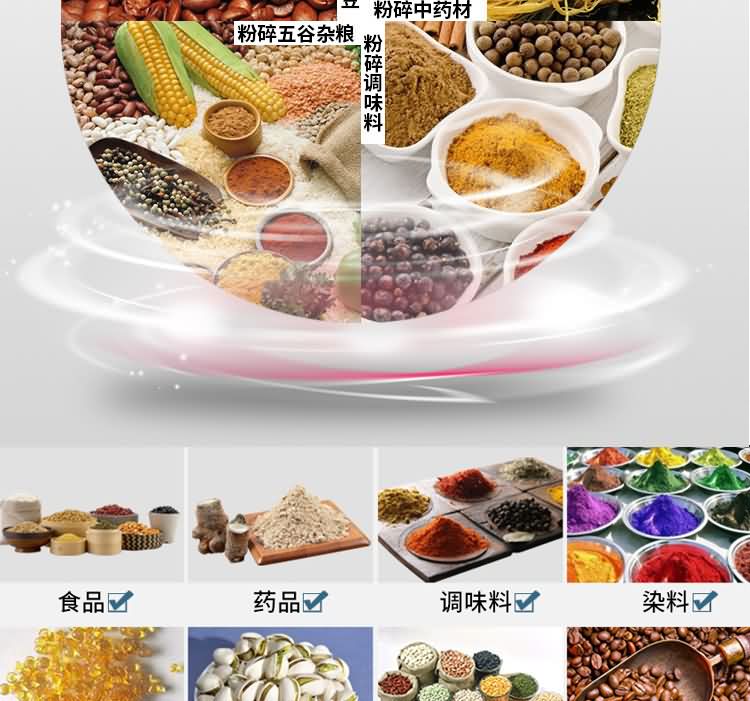 二代超微粉碎機(jī)組能處理如化學(xué)制品、食品、藥品、化妝品、染料、樹(shù)脂、殼物等多種物料的粉碎及分級(jí),該機(jī)能對(duì)大米、白糖、各種豆類、沉香木、花椒、胡椒、咖啡豆、可可豆、茴香、八角、桂皮、孜然、豆蔻、百里香等各種物料起到良好的粉碎效果。