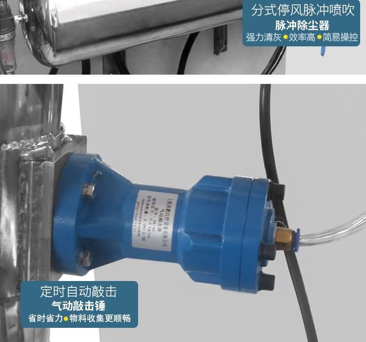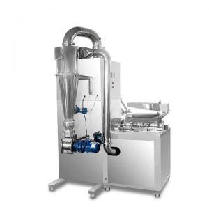 以電機(jī)帶動(dòng)傳動(dòng)軸高速運(yùn)轉(zhuǎn),物料進(jìn)入粉碎腔時(shí)由前排錘頭進(jìn)行初次粉碎,形成細(xì)小顆粒進(jìn)入活動(dòng)錘盤內(nèi),經(jīng)錘盤內(nèi)的活動(dòng)錘片及風(fēng)葉對(duì)物料的二次粉碎,最后流向分級(jí)腔,由分級(jí)盤對(duì)物料進(jìn)行最后的粉碎分級(jí),合格的產(chǎn)品通過(guò)分級(jí)盤縫隙,經(jīng)管道進(jìn)入沙克龍收集器,由卸料器收入接料容器。含塵的氣體則進(jìn)入除塵柜,經(jīng)濾袋過(guò)濾,粉塵被阻隔在柜中,由脈沖裝置震打而落入收料箱中,凈化的后的氣體經(jīng)排風(fēng)口排出箱體。