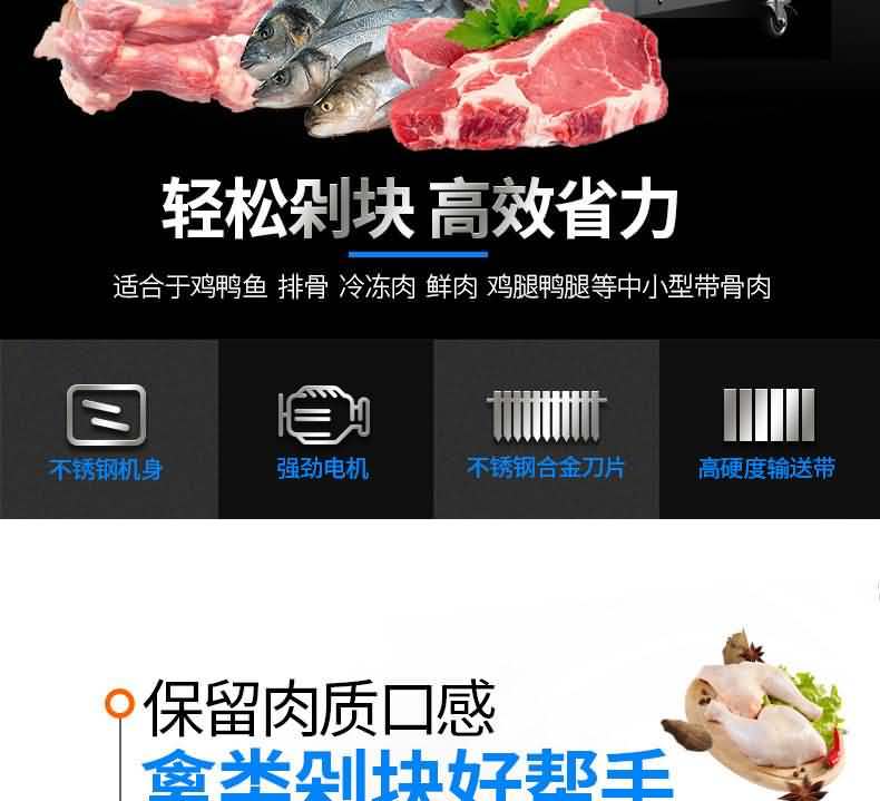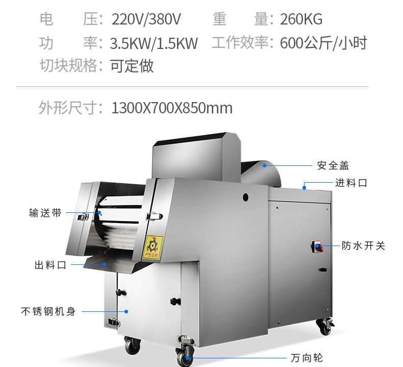 本機(jī)性?xún)r(jià)比高,模擬以手工切斷,切塊的原理采用“變速機(jī)構(gòu),自動(dòng)送料”的結(jié)構(gòu)研制而成。無(wú)損耗,采用特殊刀具刀塊,自動(dòng)加厚履帶輸送,避免了切塊的危險(xiǎn)性,使用安全性較高,切斷過(guò)程中不產(chǎn)生廢料,很大程度的保護(hù)了您的利益,節(jié)省人工,一機(jī)可抵多人工作,每小時(shí)可剁切600公斤,大大提高生產(chǎn)效率。廣泛用于大中小型食品加工廠、集體食堂、屠宰場(chǎng)、肉聯(lián)加工廠、超市等。適用于雞肉、鴨肉、魚(yú),中小型動(dòng)物骨頭、冷凍肉、鮮肉、凍雞、雞腿等帶骨肉類(lèi),可根據(jù)需要剁塊、段、條等,大小可調(diào)。