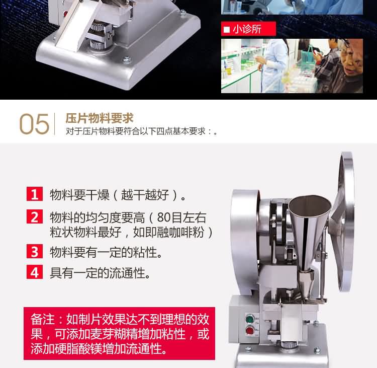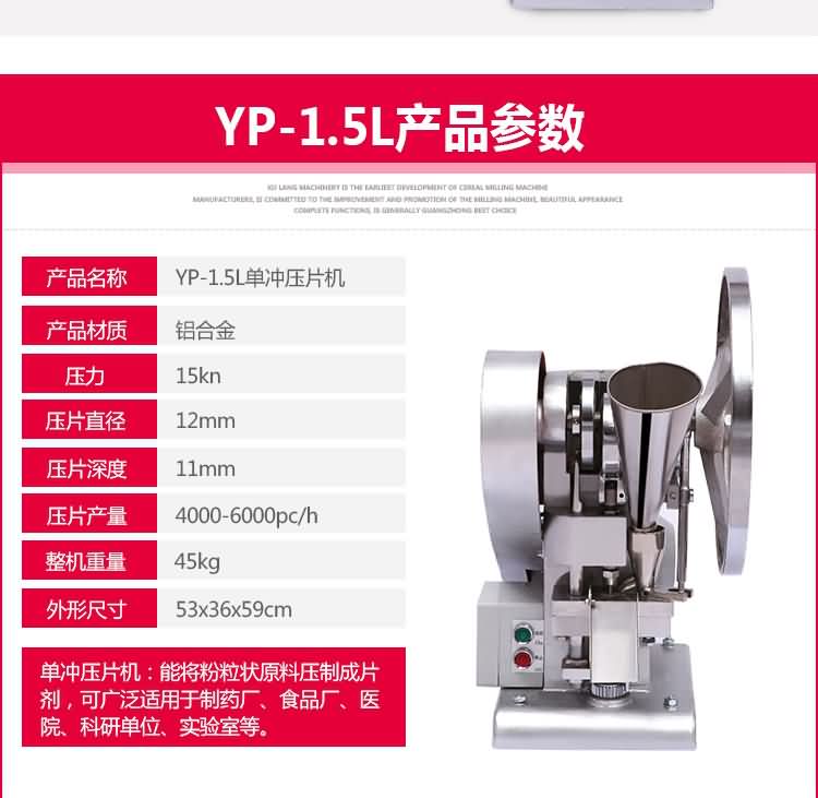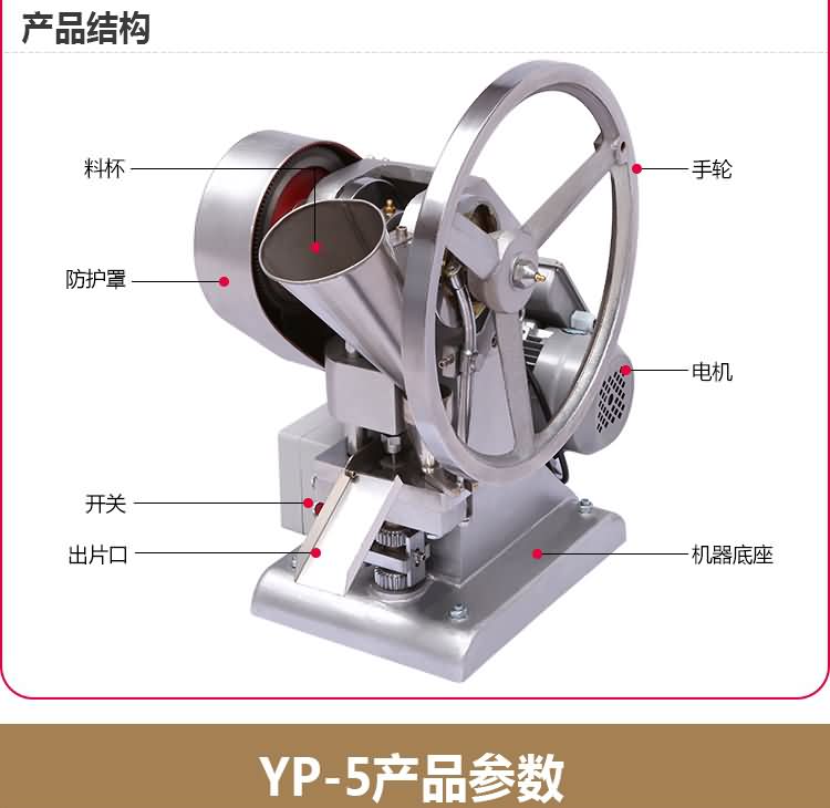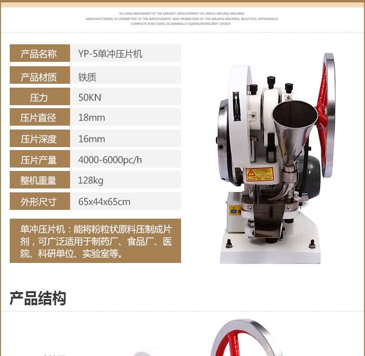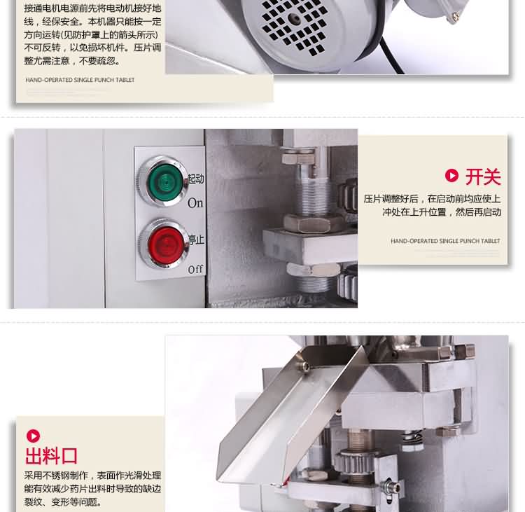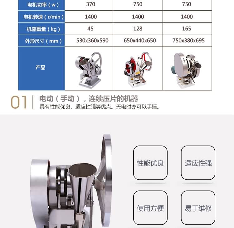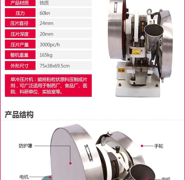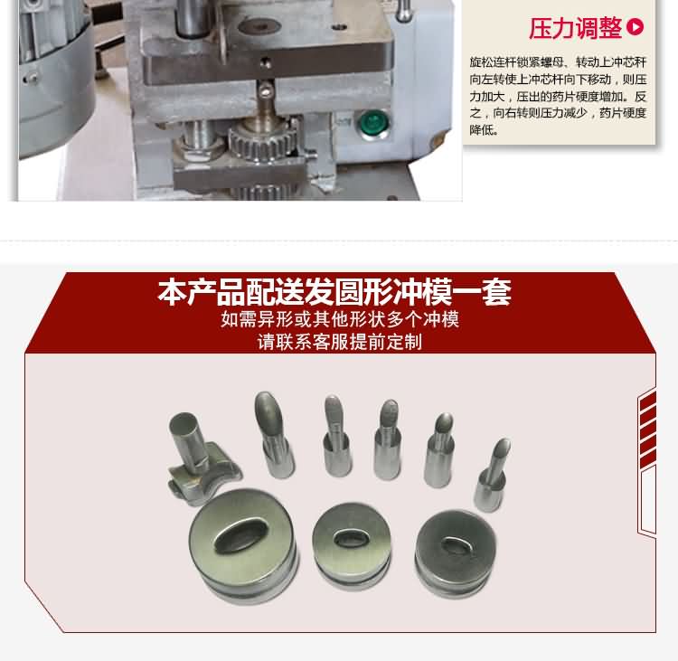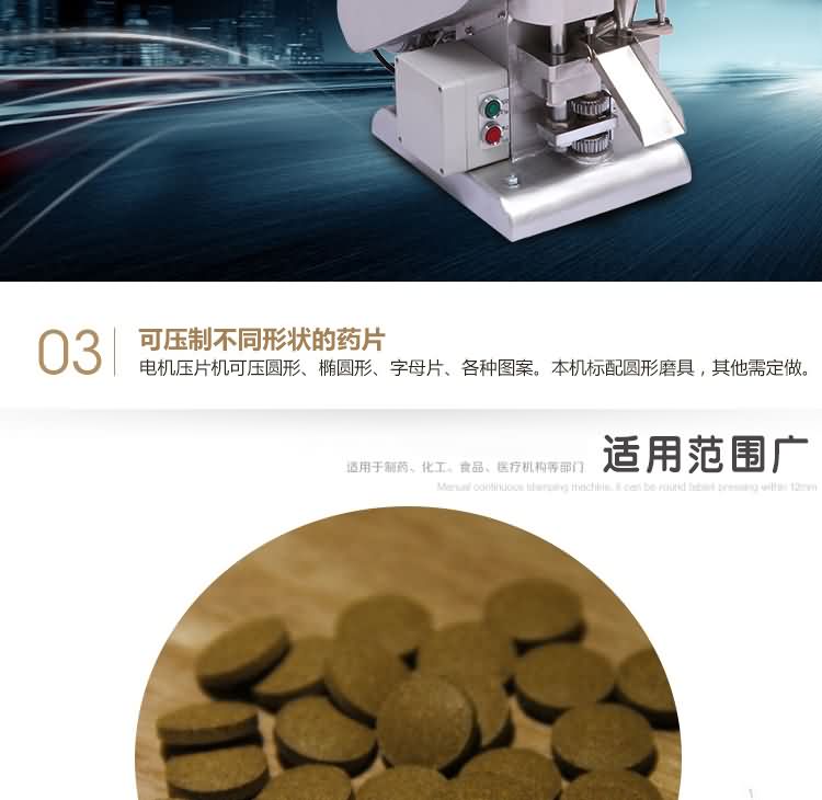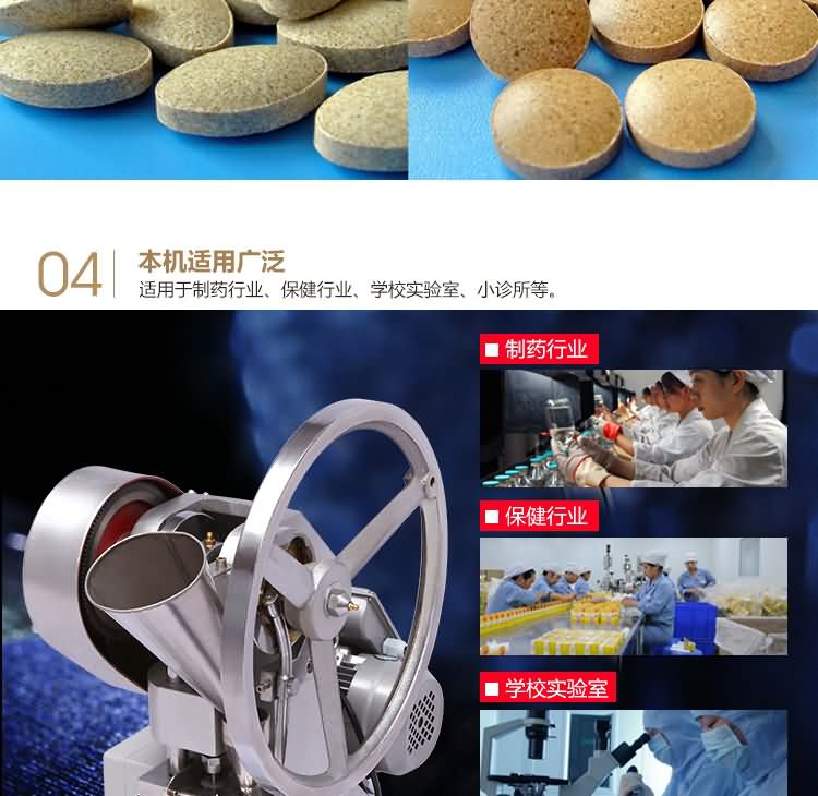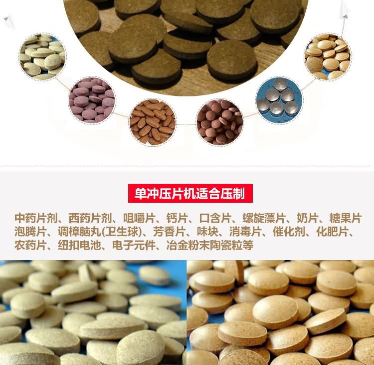 單沖壓片機(jī)適合壓制中藥片劑、西藥片劑、咀嚼片、鈣片、口含片、螺旋藻片、奶片、糖果片、泡騰片、調(diào)樟腦丸(衛(wèi)生球)、芳香片、味塊、消毒片、催化劑、化肥片、農(nóng)藥片、紐扣電池、電子元件、冶金粉末陶瓷粒等。是一種小型臺式電動(手動)連續(xù)壓片的機(jī)器,機(jī)上裝一付沖模,物料的充填深度,壓片厚度均可調(diào)節(jié)??筛鶕?jù)客戶要求提供各種形狀的模具。單沖壓片機(jī)能將粉粒狀原料壓制成片劑,可廣泛適用于制藥廠、化工廠、醫(yī)院、科研單位、實(shí)驗(yàn)室試制和小批量生產(chǎn)。本機(jī)性能優(yōu)良,適應(yīng)性強(qiáng),使用方便,易于維修,體積小,重量輕,無電時也可手搖片。本機(jī)只裝一付沖模,物料的充填深度,壓片厚度均可調(diào)節(jié),能適應(yīng)制藥行業(yè)壓制各種中、西藥征劑的要求和其它行業(yè)壓制各種類似產(chǎn)品的要求,深受各行業(yè)廣大用戶的歡迎。