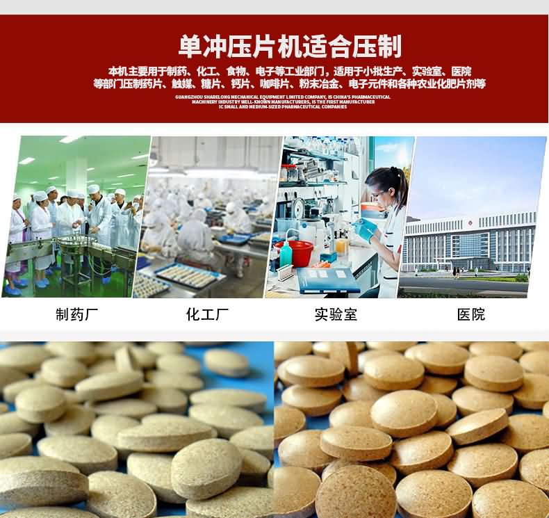 本機主要用于制藥、化工、食物、電子等工業(yè)部門,適用于小批生產、實驗室、醫(yī)院等部門壓制藥片、觸媒、糖片、鈣片、咖啡片、粉末冶金、電子元件和各種農業(yè)化肥片劑等。它可壓制各種異形,并可壓制雙面刻有商標、文字及簡單圖形的片劑。