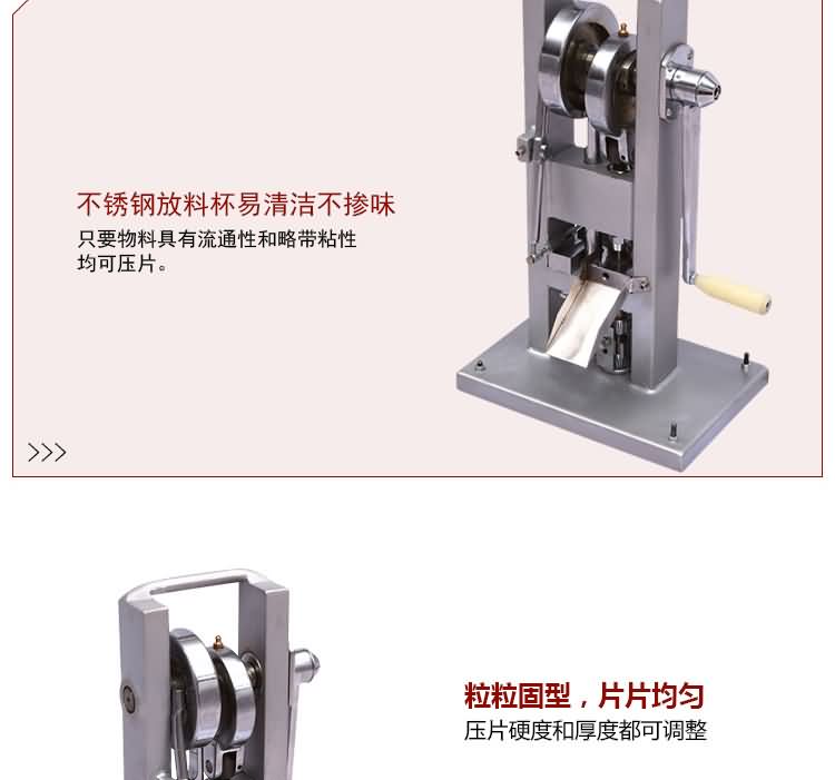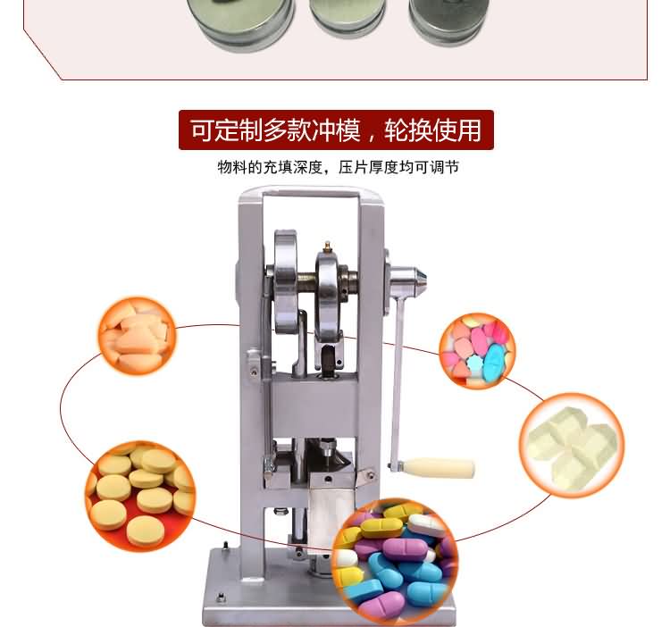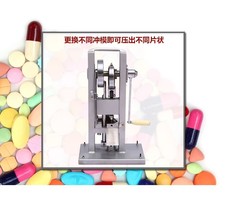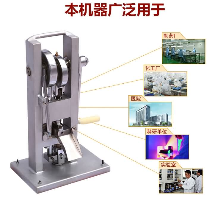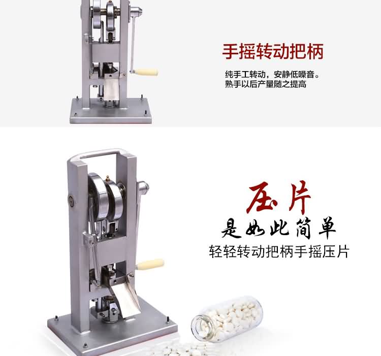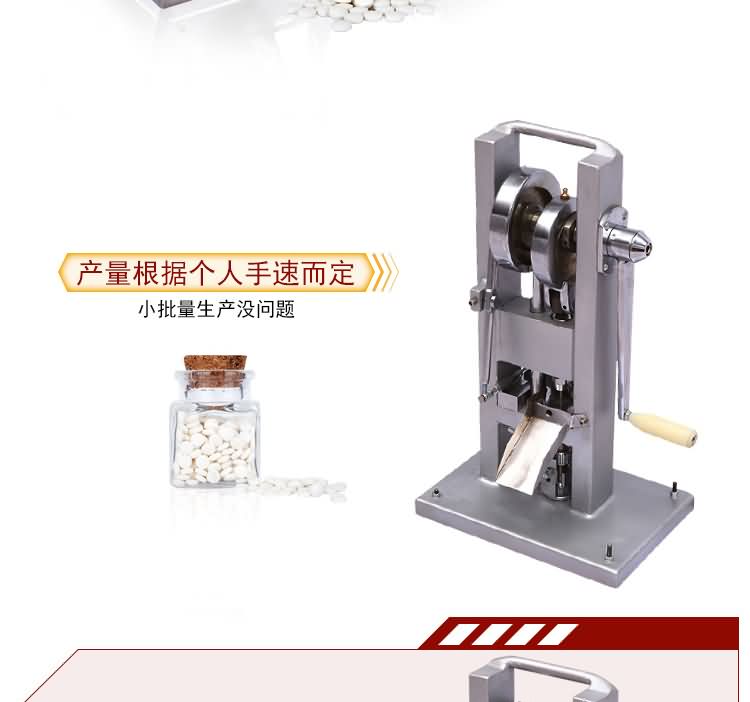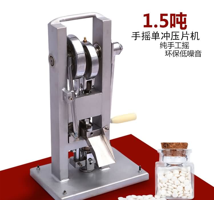 手搖式單沖壓片機沒有電機傳動,無需電源。用以將各種顆粒狀原料壓制成圓片,適用于實驗室試制、教學(xué)、小規(guī)模生產(chǎn)各種藥片、糖片、鈣片等,是一種小型臺式連續(xù)壓片的機器,性能優(yōu)良,適應(yīng)性強,使用方便,易于維修,體積小,重量輕,本機只裝一付沖模,物料的充填深度、壓片厚度均可調(diào)節(jié),能適應(yīng)制藥行業(yè)壓制各種中、西藥片劑的要求和其它行業(yè)壓制各種類似產(chǎn)品的要求,深受各行業(yè)廣大用戶的歡迎。
