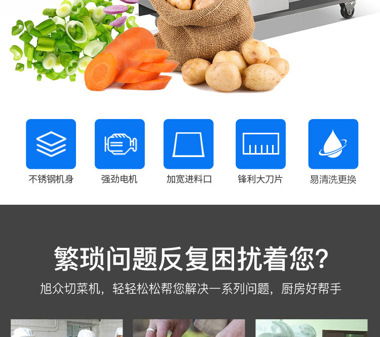 用于硬、軟各種根、莖、葉類蔬菜和海帶的加工,可切制片、塊、絲、丁、菱形、曲線形多種花樣。