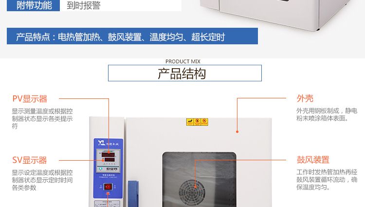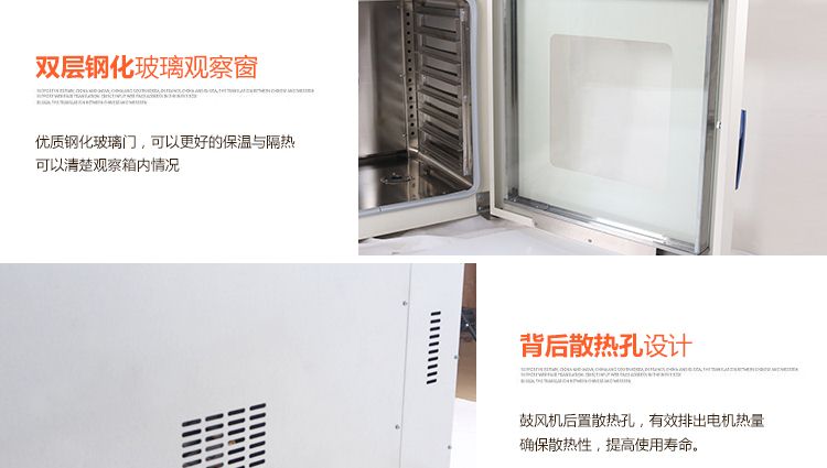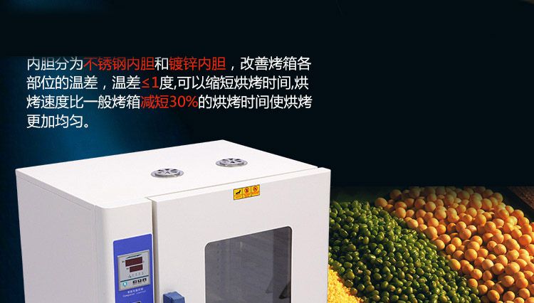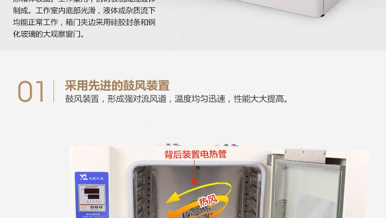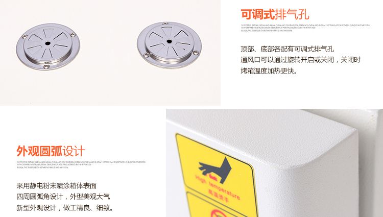 本系列烤箱在工作室后部裝有發(fā)熱管,后面裝有鼓風(fēng)裝置,溫度控制儀控制溫度恒定及高低,工作時經(jīng)發(fā)熱管加熱再經(jīng)鼓風(fēng)裝置循環(huán)流動,確保溫度均勻,四周圓弧設(shè)計,擱板上下間距可調(diào),內(nèi)置感溫探頭。