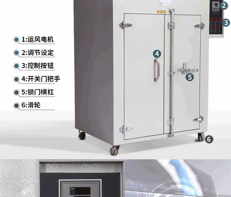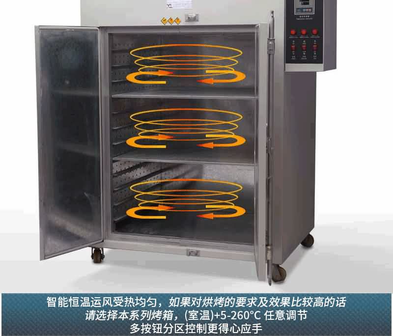 運(yùn)風(fēng)式智能烤箱采用大直徑鳳輪循環(huán)形式,因此具有循環(huán)風(fēng)量大、熱量流通均勻等特點(diǎn),適用于工業(yè)各行業(yè)或需要烘烤面積大或數(shù)量多的產(chǎn)品,如電鍍業(yè)、電子業(yè)、合金飾品、塑膠定型等烘干、脫水,但不適用于帶強(qiáng)揮發(fā)性、易燃易爆等物品,以免引起爆炸。