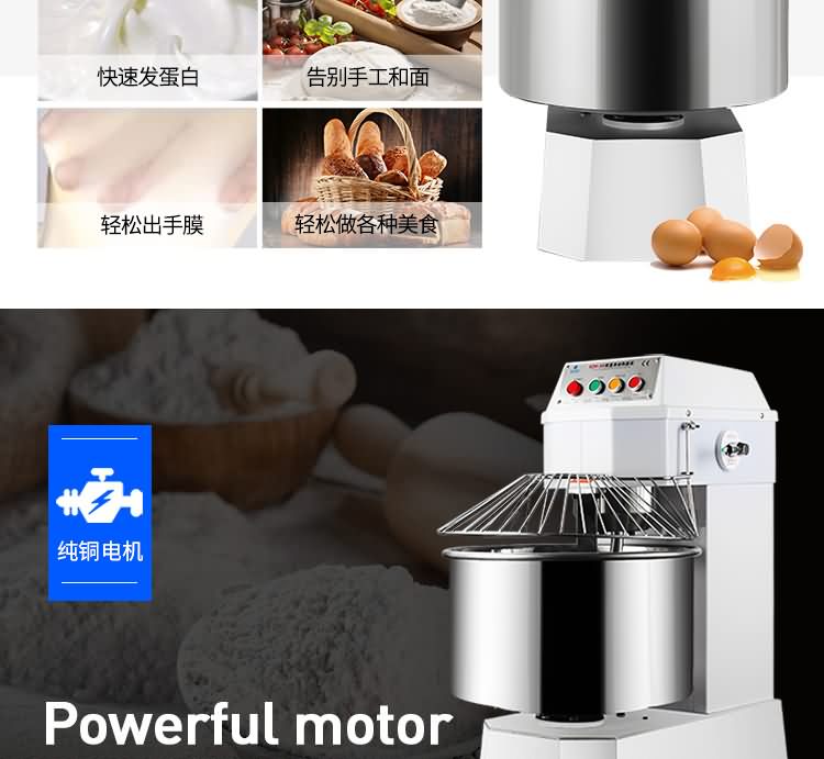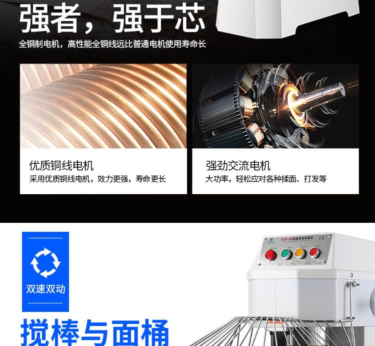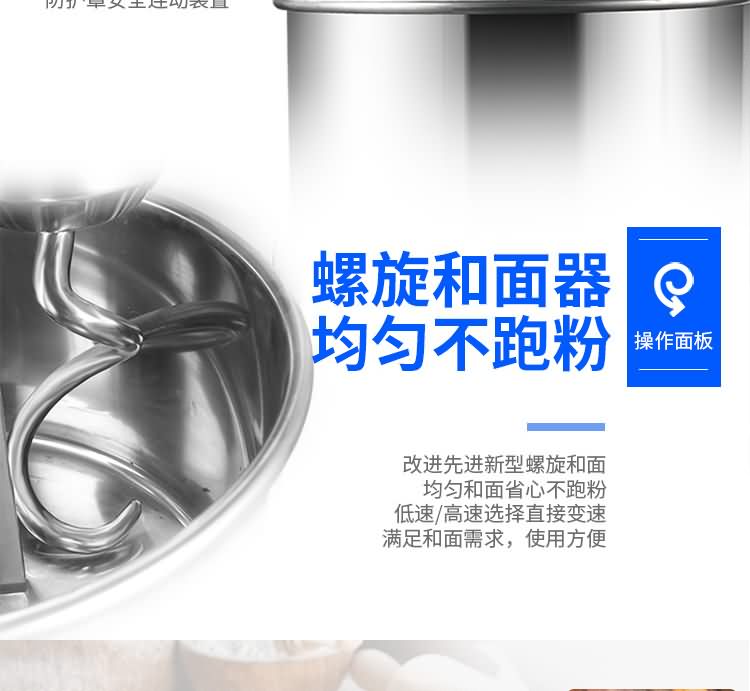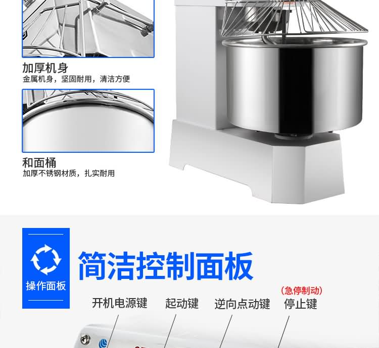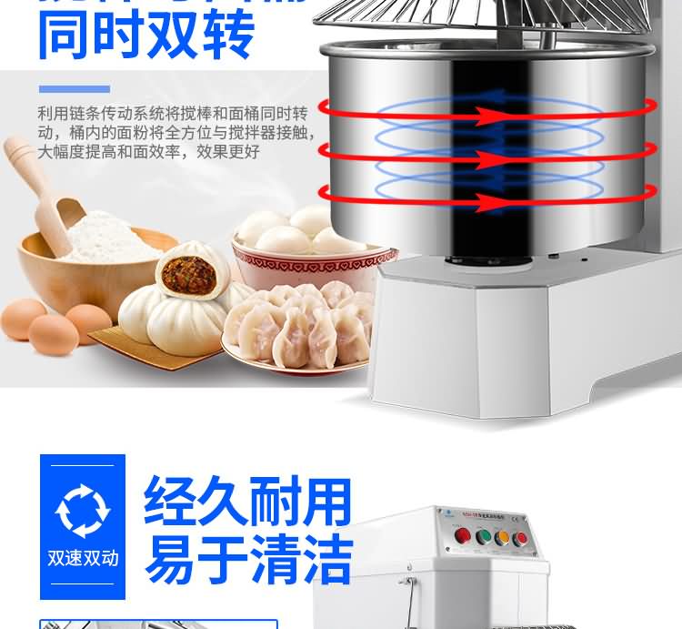 雙速雙動(dòng)和面機(jī)系列,本機(jī)適合攪拌各種面包、包子、饅頭、湯圓、披薩餅面團(tuán),專業(yè)設(shè)計(jì)避免面團(tuán)過(guò)分升溫并確保面團(tuán)含氧量。過(guò)載、缺相保護(hù)裝置,防護(hù)罩安全連動(dòng)裝置。