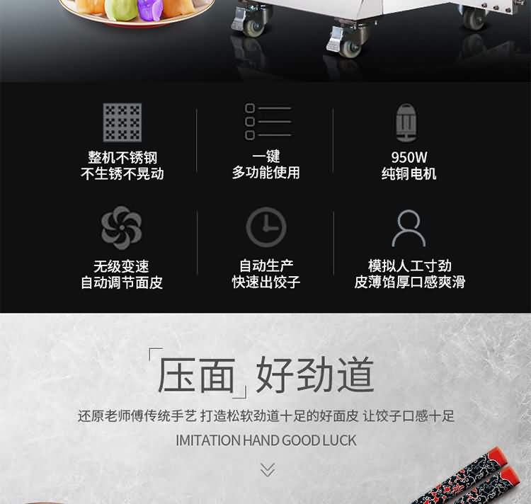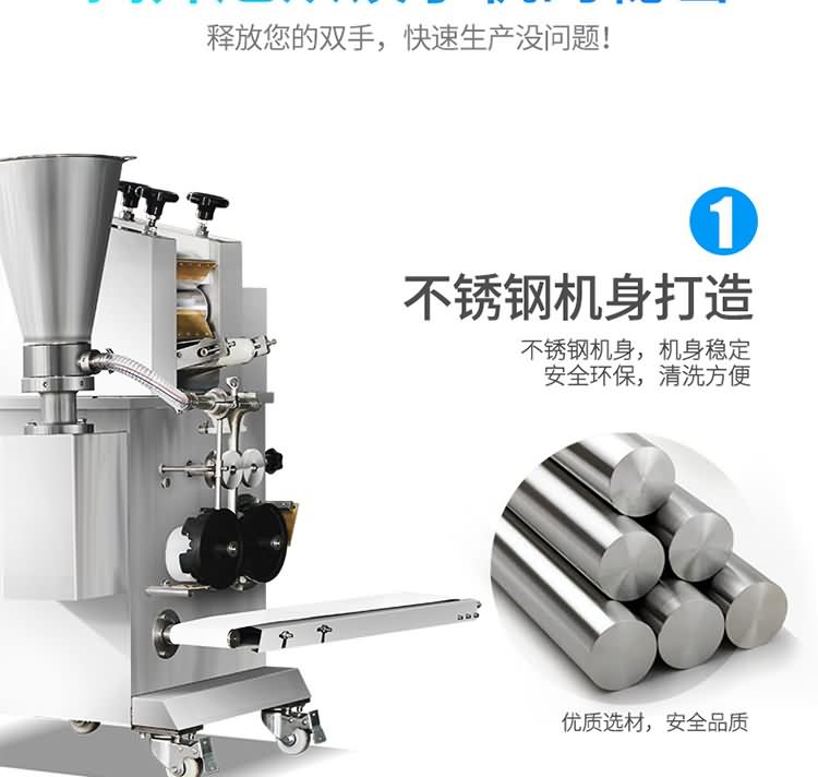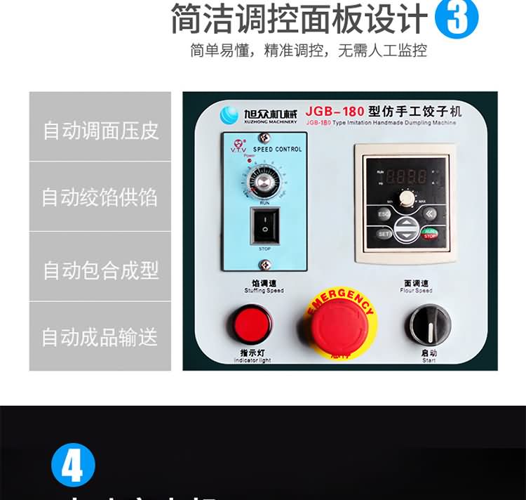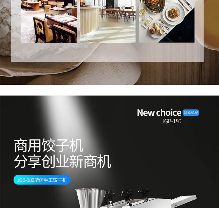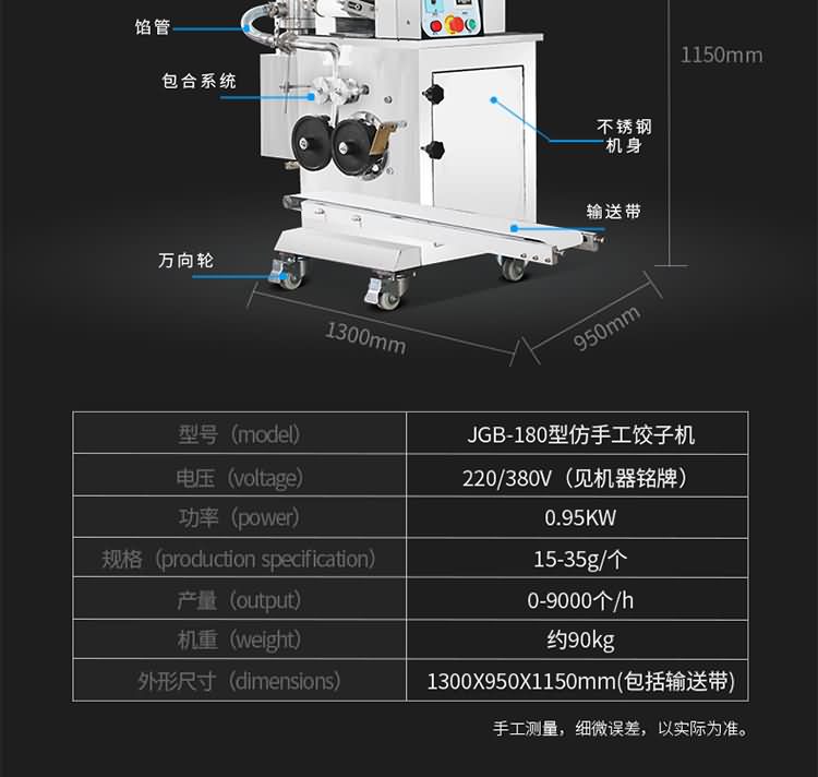 JGB-180仿手工餃子機(jī),先進(jìn)的自動(dòng)餃子生產(chǎn)設(shè)備,包括主動(dòng)壓皮部分、自動(dòng)供餡部分、自動(dòng)包合部分、自動(dòng)成品輸送部分,并且只要更換模具,就可制鍋貼等食品。適合食品速凍廠、飯店、廠礦學(xué)校食堂等制作包餡面制品單位使用。