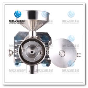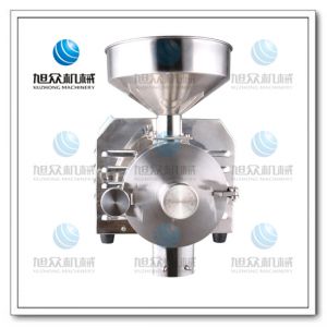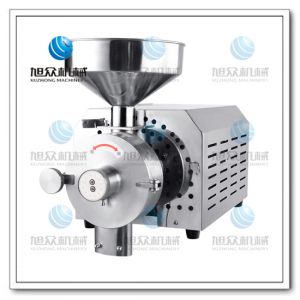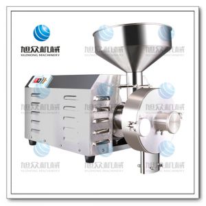 磨粉機的電機啟動運轉(zhuǎn)時,連接軸以及套在連接軸上的磨盤一起運轉(zhuǎn)。待磨物料從料斗進入磨粉套,磨盤的絞龍和磨粉套之間的相對運轉(zhuǎn),破碎力使物料絞碎成小塊顆粒,絞碎后的小顆粒在磨盤絞龍的螺旋運動下被帶進兩塊磨片中間,磨片齒紋的相對運轉(zhuǎn),使物料在短時間內(nèi)被粉碎成細小的粉狀顆粒,粉從磨片的齒溝流出,甩向四周,同時被裝在磨盤上的刮粉板帶下,從出粉口流出來。