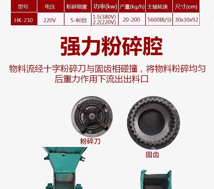 HK-230型多用粉碎機體積不大,功能強勁,粉碎量大,適用范圍廣,對各種糧食、大部分中藥材均能達到比較理想的粉碎效果,出料塊,操作簡單??梢耘涮?20V或者380V電機,屬高速錘式粉碎機,進入粉碎腔的物料和高速運轉(zhuǎn)的錘片碰撞以及物料間相互撞擊,從而達到快速粉碎的理想效果。適合加工粉碎各種糧食、中藥材、樹根、樹枝、木頭、礦石、干燥果皮和瓜類等物料。適合生產(chǎn)、加工使用,也可以作為混合物料使用。
