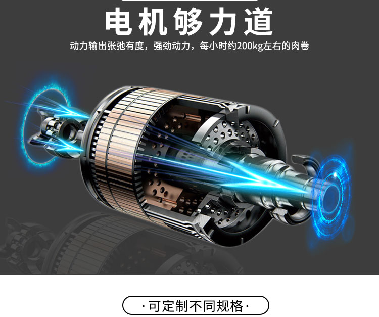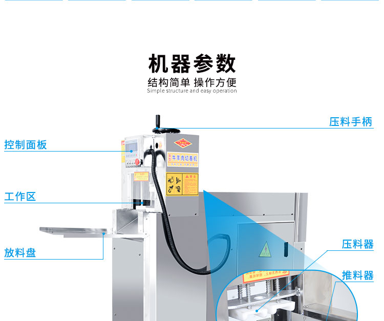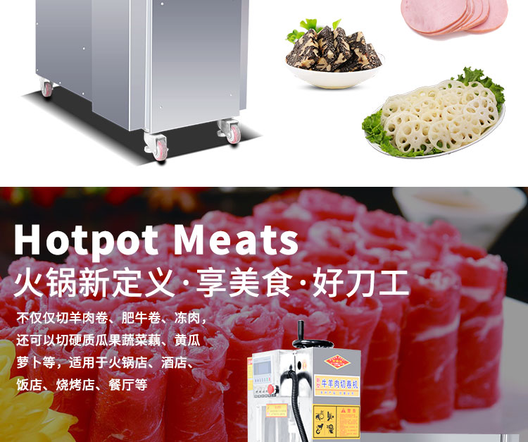 4.自動化程度高,肉片切制,厚度調(diào)節(jié)。肉卷輸送,自動停機。均可一鍵完成,省工省時