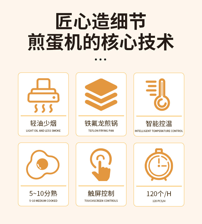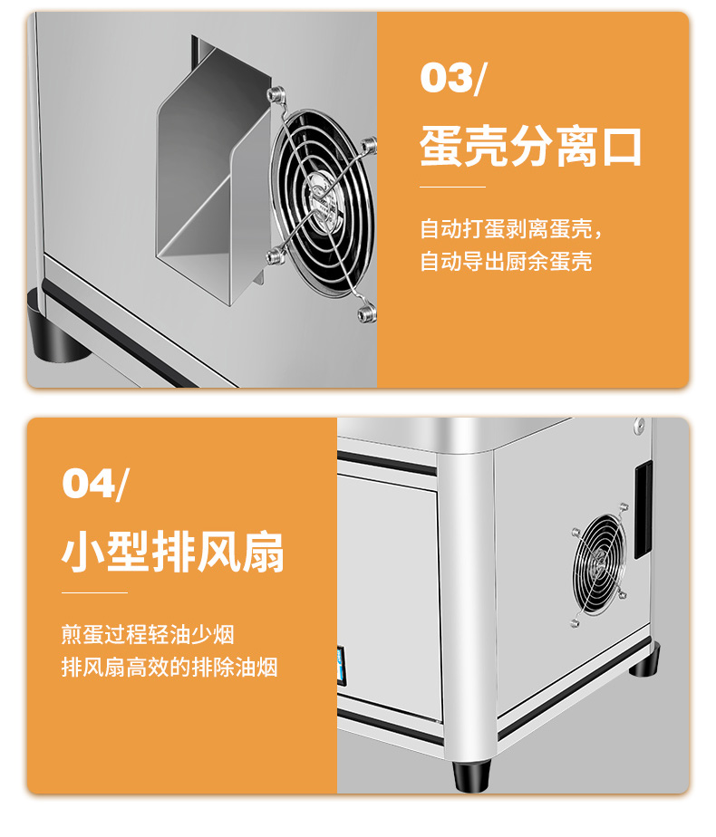商用全自動(dòng)智能煎蛋機(jī),匠心造細(xì)節(jié)煎蛋機(jī)的核心技術(shù),輕油少煙、5~10分熟、鐵氟龍煎鍋、觸屏控制、智能控溫??谖秱€(gè)性化五分/七分/十分熟,智能控溫上下鍋恒溫煎烤。