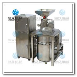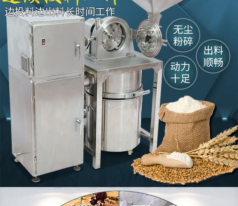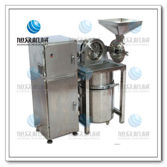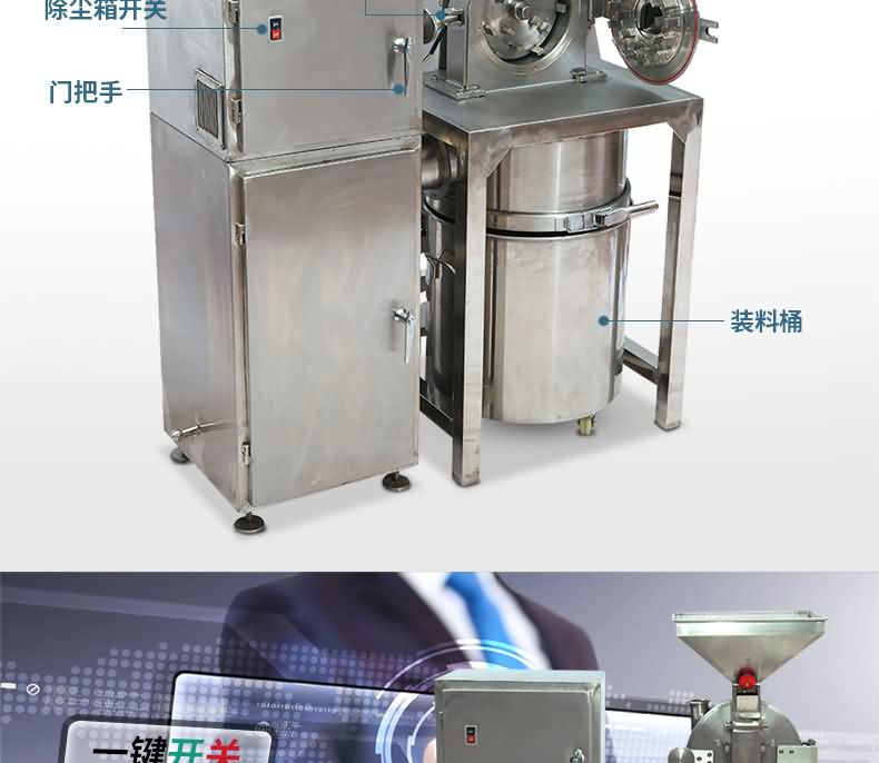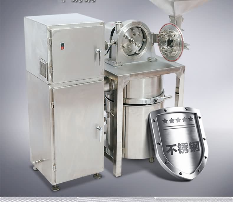 不銹鋼除塵粉碎機,全不銹鋼制造,304材質(zhì),符合GMP要求。主要適用于制藥、化工、食品等行業(yè)的物料粉碎。本機利用活動齒盤和固定齒盤的相對運動,以及物料之間的相互撞擊作用,從而使粉碎腔內(nèi)的物料獲得破碎、粉碎。本機配備篩網(wǎng),篩網(wǎng)可以根據(jù)客戶要求進行更換,當(dāng)物料被粉碎到小于篩孔直徑時,粉劑從篩網(wǎng)中出來,落入下方的集料桶內(nèi),在桶內(nèi)飄揚的粉塵則通過除塵電機的作用被吸入到除塵箱內(nèi)的除塵袋中過濾,空氣由風(fēng)機排出室外。