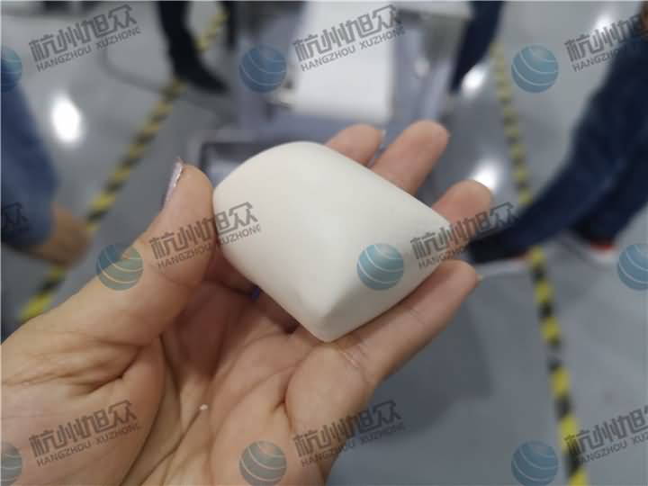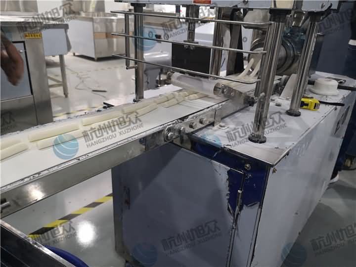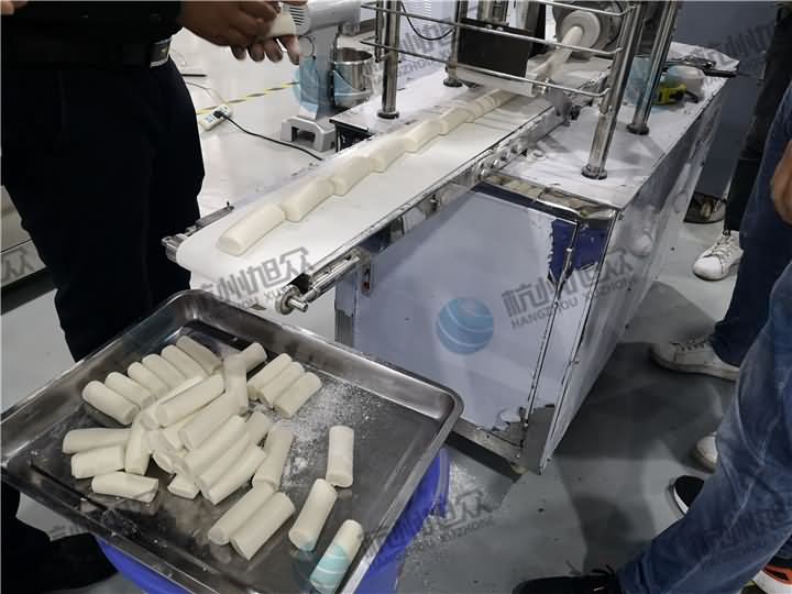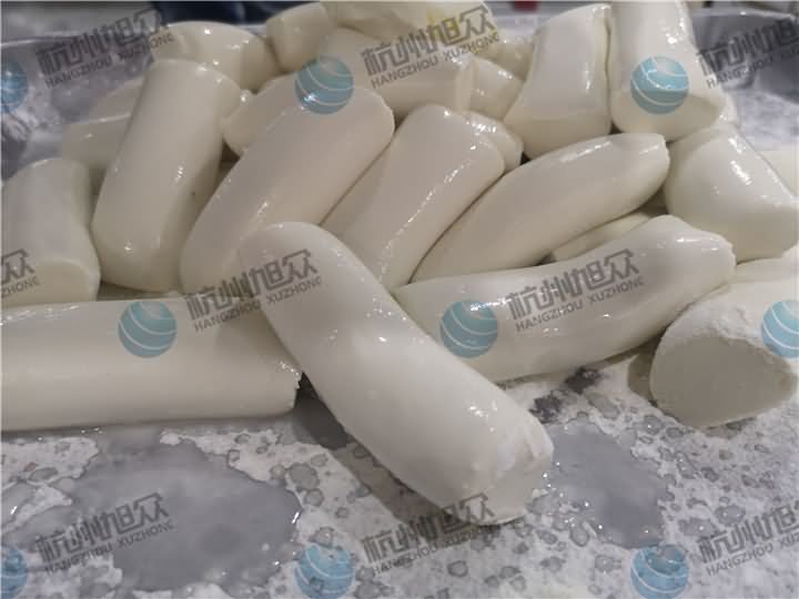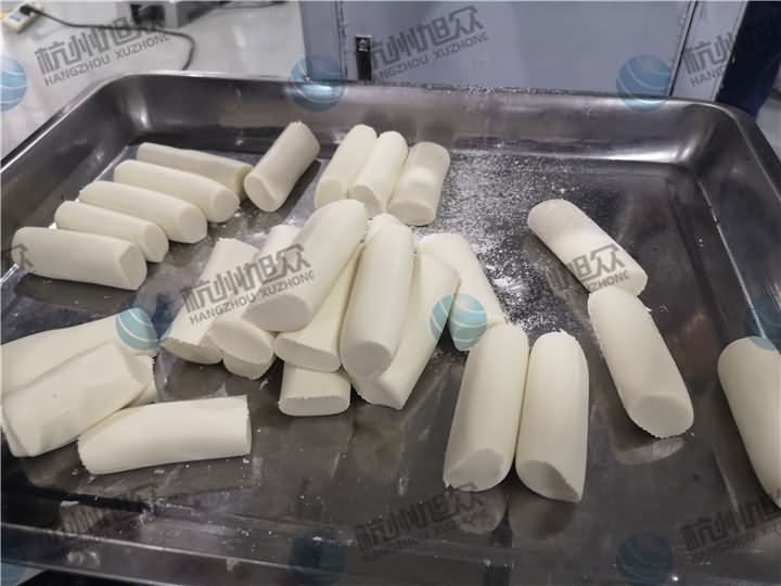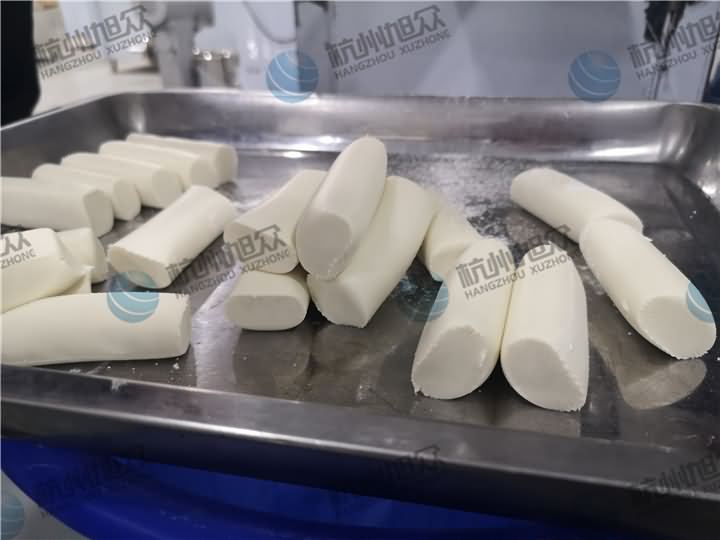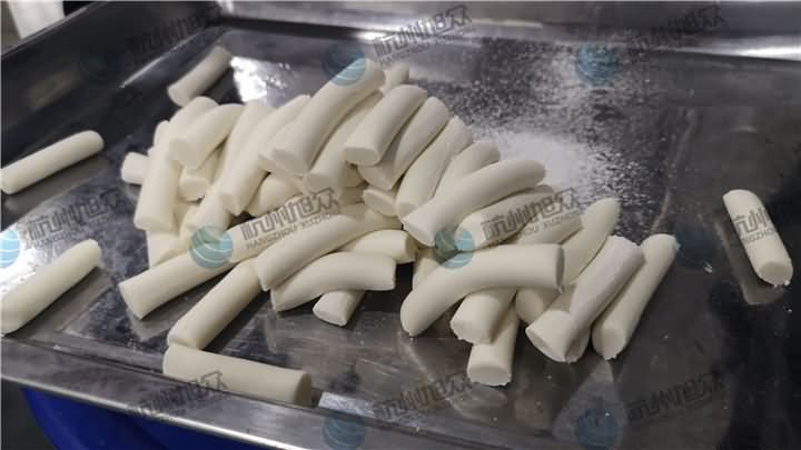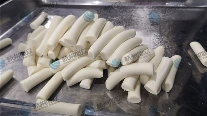 做芋圓啦!不過今天的客戶從山東不遠(yuǎn)千里來到杭州旭眾,因?yàn)樗麄冏约河性谧鲇髨A,有著自己獨(dú)有的芋圓工藝技術(shù),所以前期的工作都是他們的人員加工揉面成團(tuán),再通過芋圓機(jī)切割成他們想要的規(guī)格,由剛開始出兩孔的小芋圓變成單孔的大芋圓,也不知道他們的原料是什么,聞起來有一股奶糖的味道很香,那我們來看看芋圓機(jī)做出來的芋圓效果: