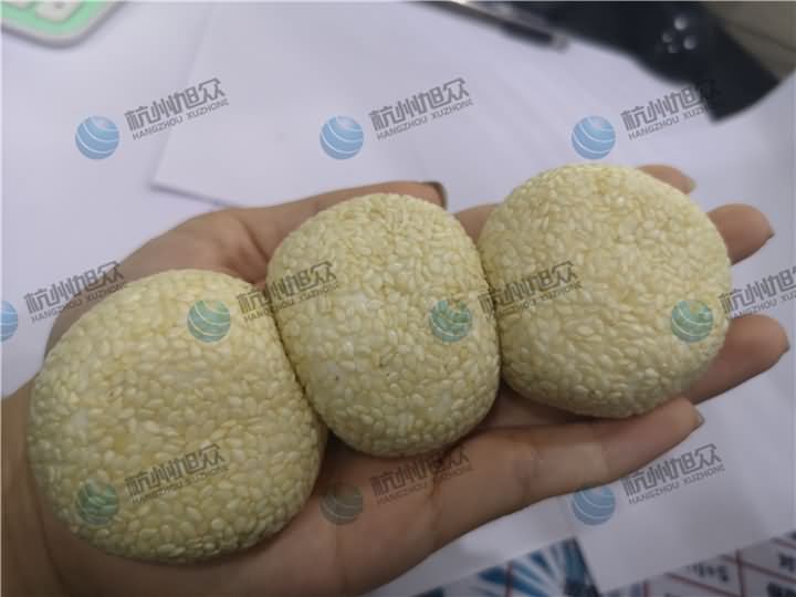 包餡機(jī)做出來的麻球就是這么一個(gè)光溜溜的麻球,克重大概48g左右,皮在46g,芝麻餡占非常小的比例,然后客戶還要裹白芝麻外衣,不可裹粉機(jī)目前沒有樣機(jī),試不了于是采用了人工去給它們裹上白芝麻的效果如下圖: