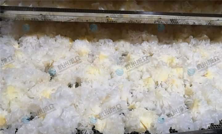 將采收后的銀耳,用利刀削去耳基,挖凈殘物。然后放進(jìn)清水池浸泡40-60分鐘,讓耳片吸飽水分,并進(jìn)行清洗。泡洗的目的是消除粘附在耳片的雜物,使耳片晶瑩、透亮,同時(shí),讓子實(shí)體膨松,耳花舒展,加工后外觀美,朵形好