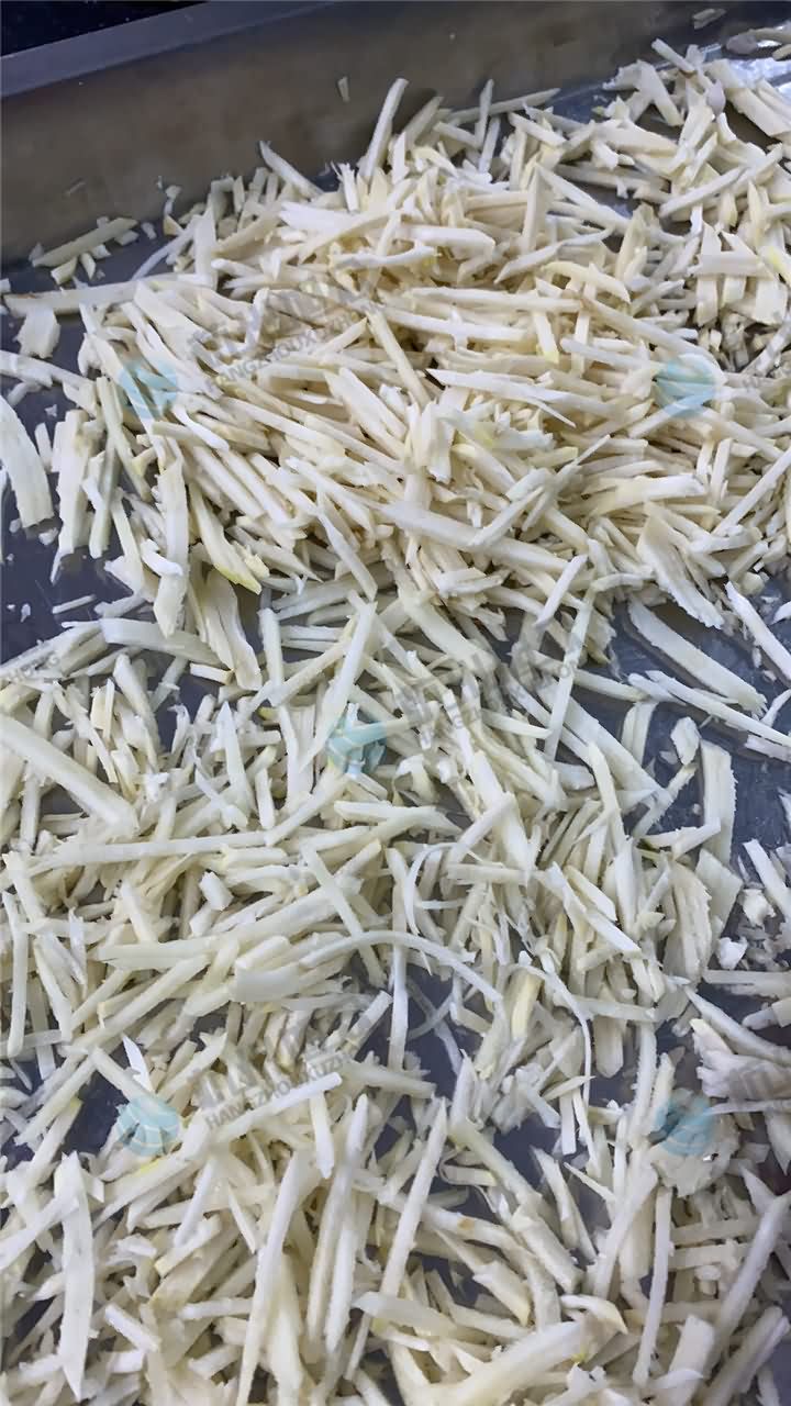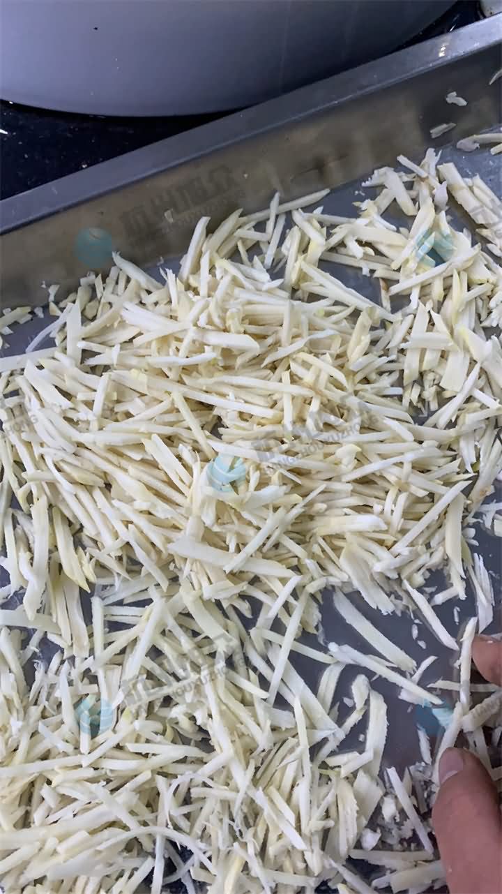 今天一大早就有客戶帶著竹筍來(lái)到現(xiàn)場(chǎng),用多功能切菜機(jī)切筍絲效果: