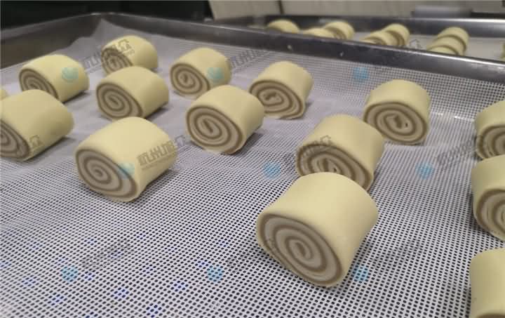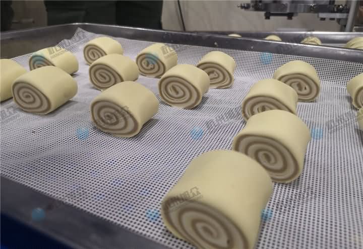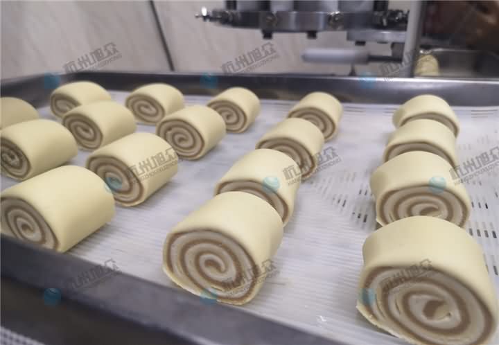 3、將擺放好的面皮放置XZ-290AS卷面式包子機(jī)輸送架上,開啟開關(guān),自動(dòng)整形壓面卷面切割成方饅頭
