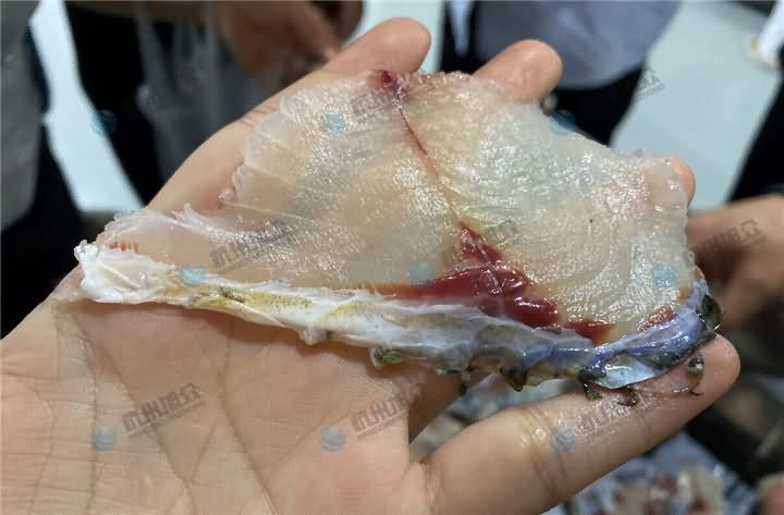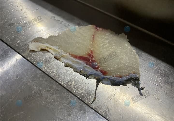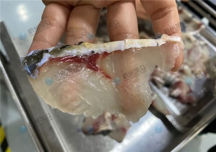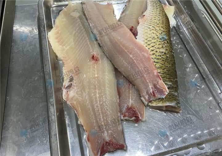 全自動切魚片機現(xiàn)場演示切草魚片,在切草魚片之前要做的工序,先去鱗開肚去內臟去魚頭后,再將魚大骨去掉,不去的話刀片容易損壞,所以要將魚大骨剃掉后再用魚片機30°斜度切成2.3mm魚片: