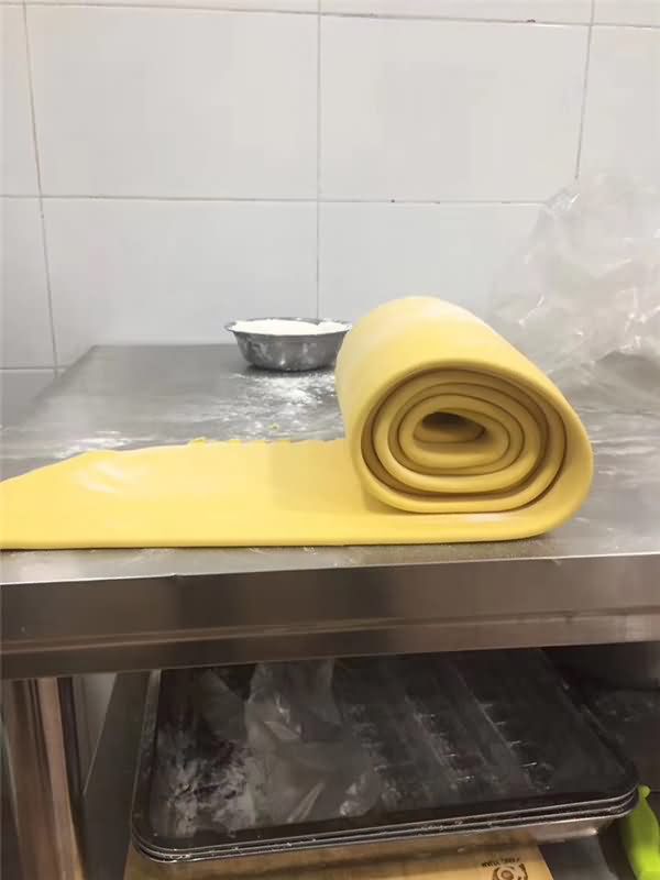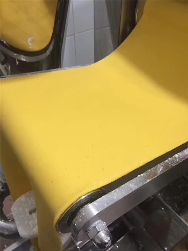 攪拌好面團(tuán)后再用自動(dòng)壓面機(jī)反復(fù)壓面皮,看著差不多就可以了