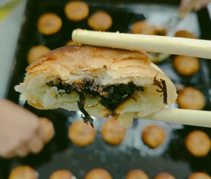 酥餅機(jī)現(xiàn)場試機(jī)做梅干菜餡酥餅
