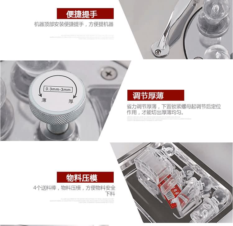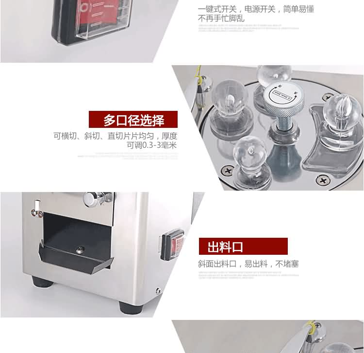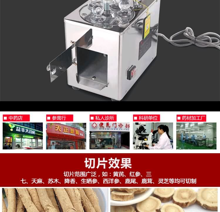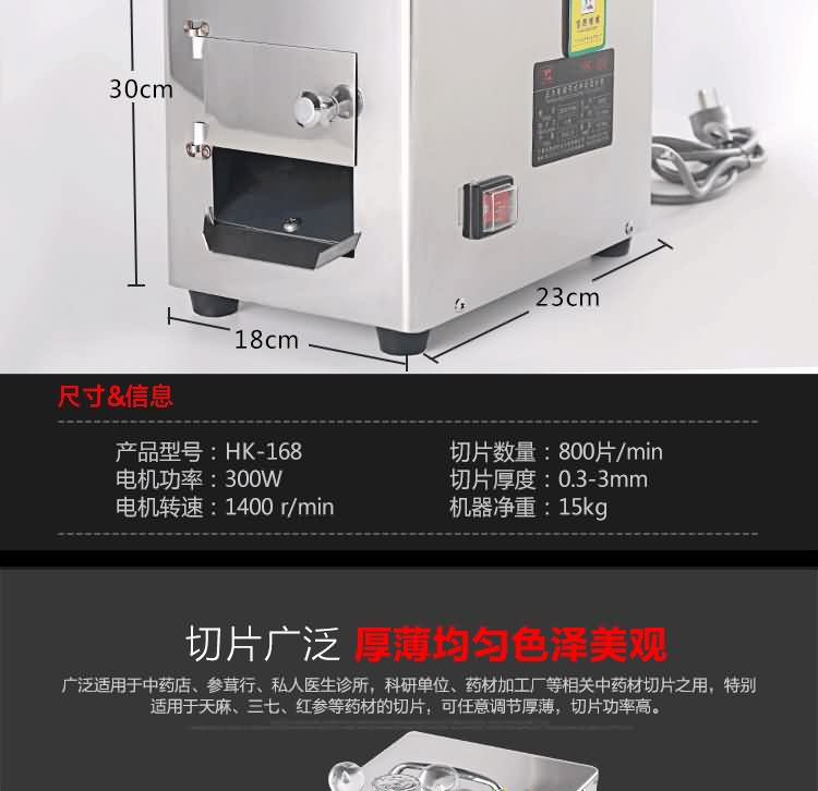 HK-168參茸切片機(jī)單相電機(jī)匹配,刀盤上安裝四把刀片,可任意調(diào)節(jié)厚薄,速比慢而切片功率高,可切成斜片,橫片,直片,每片厚薄均勻,色澤美觀。具有體積小,噪音低,操作簡單等特點(diǎn);刀片采用整體高速鋼,經(jīng)久耐用;適用于參類及其它高貴藥材的切片。