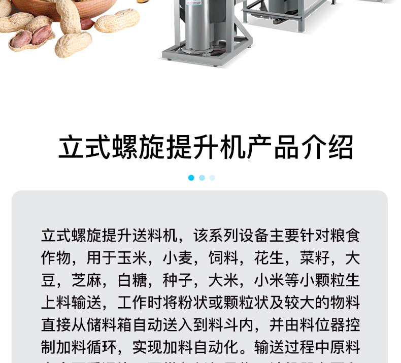 立式螺旋提升送料機(jī),該系列設(shè)備主要針對糧食作物,用于玉米,小麥,飼料,花生,菜籽,大豆,芝麻,白糖,種子,大米,小米等小顆粒生上料輸送,工作時將粉狀或顆粒狀及較大的物料直接從儲料箱自動送入到料斗內(nèi),并由料位器控制加料循環(huán),實現(xiàn)加料自動化。輸送過程中原料不受污染,不帶入任何異物。該機(jī)器主要和榨油機(jī)、飼料機(jī)配套使用,減少粉塵、減輕勞動強(qiáng)度,提升勞動效率。料口有圓形或方形可選。
