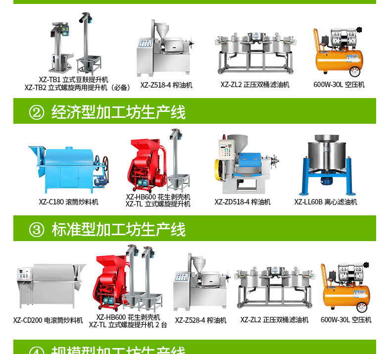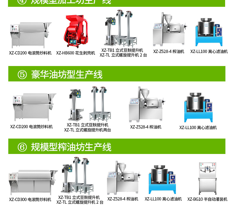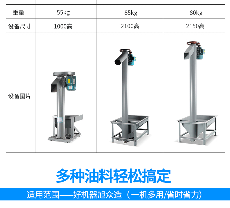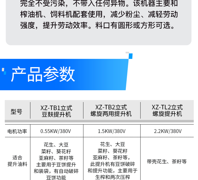 適合提升油料 | 花生、大豆、菜籽、葵花籽、亞麻籽、茶籽等,主要用于豆餅提升和裝袋,有自動破碎豆餅功能 | 花生、大豆、菜籽、葵花籽、亞麻籽、茶籽等,此提升機(jī)有豆餅破碎和提升功能,主要用于生榨和兩次壓榨 | 帶殼花生、茶籽等 |