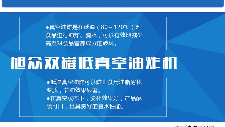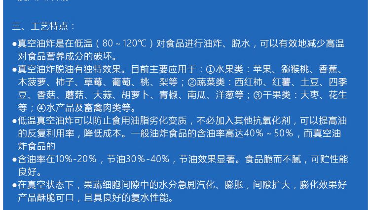 ●真空油炸是在低溫(80~120℃)對(duì)食品進(jìn)行油炸、脫水,可以有效地降低高溫對(duì)食品營養(yǎng)成分的破壞。