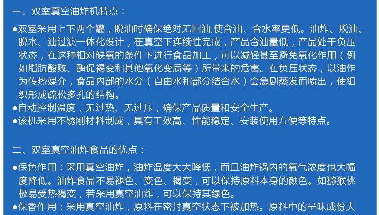 ●雙室采用上下兩個罐,脫油時確保絕對無回油,使含油、含水率低。油炸、脫油、脫水、油過濾一體化設(shè)計,在真空下連續(xù)性完成,產(chǎn)品含油量低,產(chǎn)品處于負壓狀態(tài),在這種相對缺氧的條件下進行食品加工,可以減輕甚至避免氧化作用(例如脂肪酸敗、酶促褐變和其他氧化變質(zhì)等)所帶來的危害。在負壓狀態(tài),以油作為傳熱媒介,食品內(nèi)部的水分(自由水和部分結(jié)合水)會急劇蒸發(fā)而噴出,使組織形成疏松多孔的結(jié)構(gòu)。